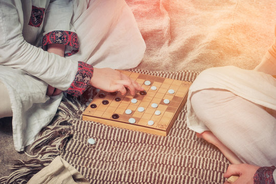 Tafl is a Scandinavian boardgame. Players at the Board game a retro style. Two men playing Hnefatafl, close-up.
