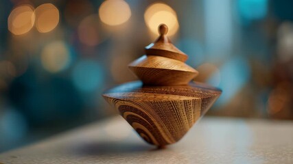 Close-up of wooden dreidel spinning mid motion on smooth table surface, soft cinematic holiday bokeh, elegant commercial editorial, dreidel game