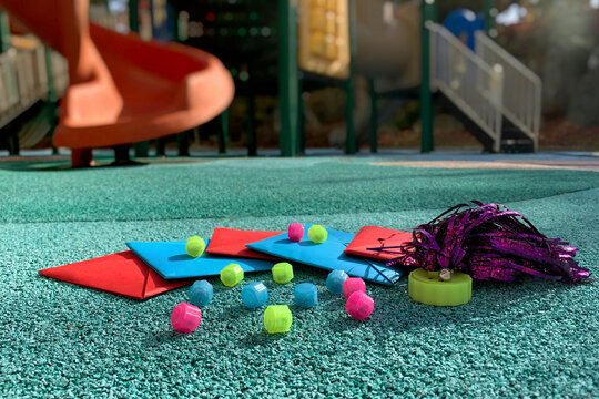 Korean traditional outdoor game tools on the playground. Gonggi, Ttakji and Jegi.