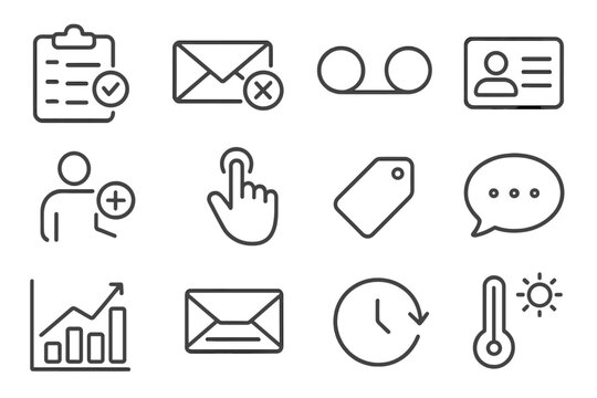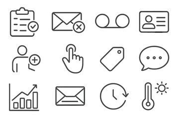 Flat vector icons of outreach and connection building: cold outreach message, follow-up email icon, mutual interest checkmark, connection request hand, open network symbol, conversation starter card,
