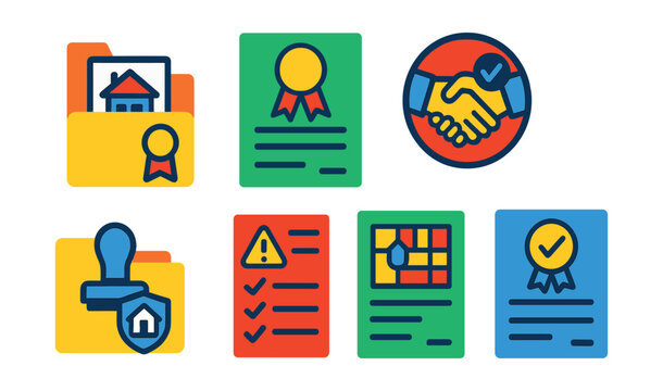 Flat vector icons of real estate customer support: client satisfaction badge, agent support headset, follow-up call icon, inquiry form clipboard, appointment reminder screen, review request message,