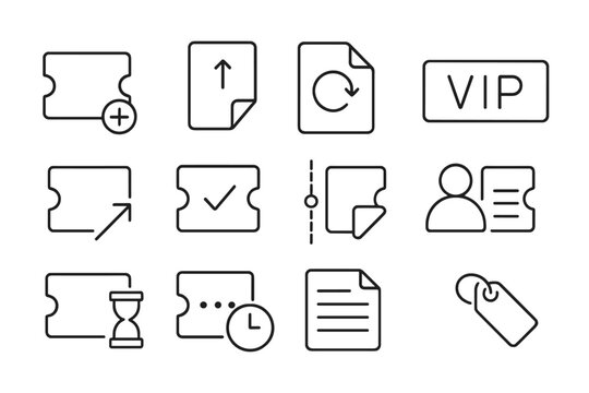 Support Ticket Icons. Line style icons of support tickets and workflow: new ticket icon, open request icon, ticket status icon,