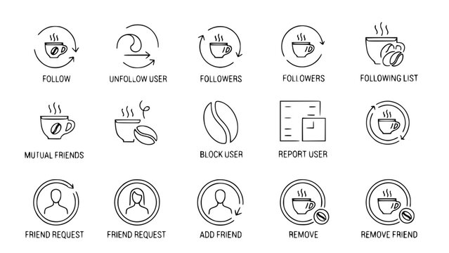 Social media actions depict communication using coffee and person icons in a minimal line style design