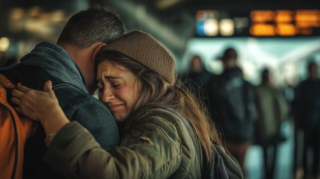 Tender Embrace of a Couple in a Crowded Train Station