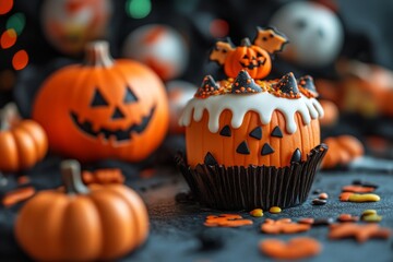 A detailed Halloween-themed cupcake adorned with a small fondant pumpkin and bat sits surrounded by decorative elements, creating a festive treat visual delight.