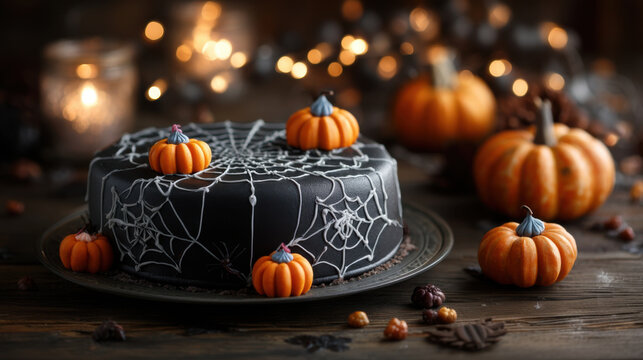 Halloween cake with black icing and white spiderweb design decorated with small fondant pumpkins, festive dessert on wooden table with warm lights and autumn atmosphere