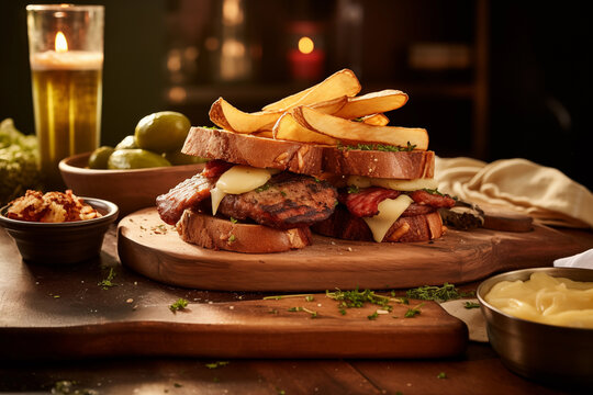 Gourmet steak sandwich with fries and a cold beer Generative AI image