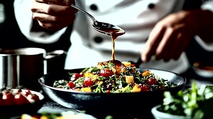 Culinary artistry in motion focused female chef creating an exquisite gourmet meal in a professional kitchen.