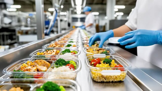 Food preparation process in a commercial kitchen, showcasing a worker arranging healthy meal containers on a conveyor belt, emphasizing efficiency and culinary artistry in meal assembly