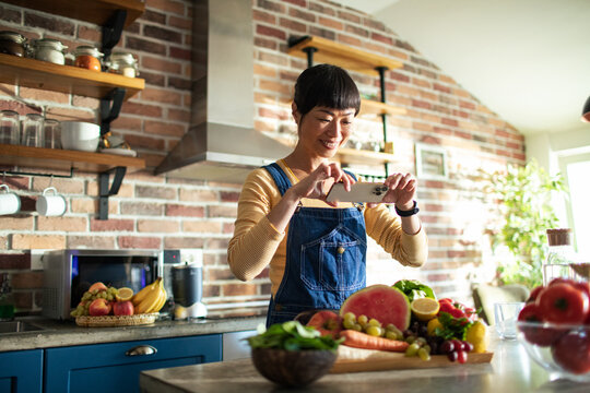 Cropped image of young woman taking photo of healthy food on smartphone