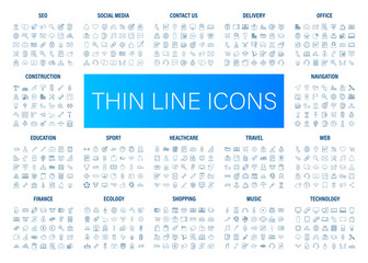 Line art set with icon set. Thin line. Social media, technology, seo, logistic, education, sport, medicine, travel, weather, construction, finance, contact us, music. Vector stock illustration.
