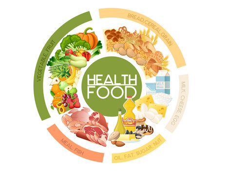 a food group pie chart alongside a pyramid diagram, illustrating the diverse categories of foods including vegetables, fruits, bread, milk, fish, and meat, against a clean white background.