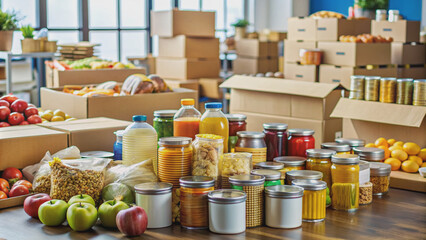 Diverse group of volunteers sorting donated food in boxes, working in community charity donation center and smiling