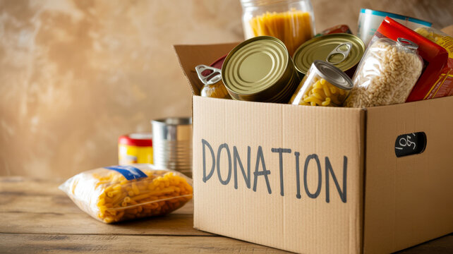 Foods donate. Holiday food drive donation, christmas charity. Volunteers collect cardboard box aid with cans and groceries vector concept. Illustration charity box, donation in cardboard