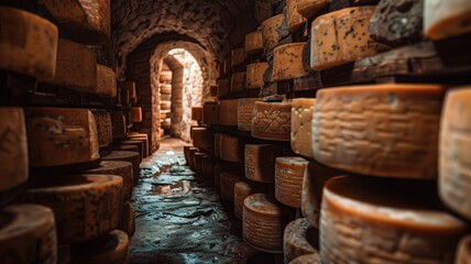 Aged cheese wheels stacked in a rustic cellar