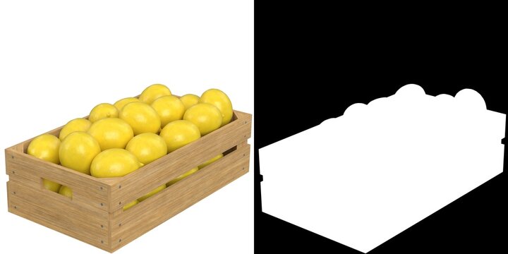 wooden crate filled with lemon on a white background