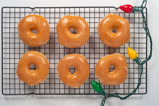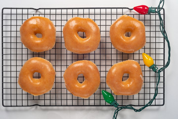 Flat lay close up of glazed doughnuts on a cooling rack on white with festive lights