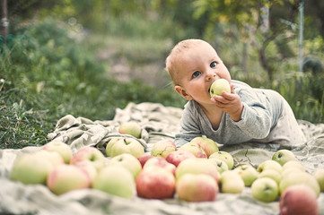 Adorable baby boy eating apple playing in the garden . Child having fun on family picnic in summer garden. Kids eat fruit. Healthy nutrition for little child. Kid with apples