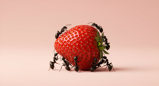 Close-up macro photograph of black ants crawling on a ripe, red strawberry against a soft pink background. A surreal and artistic depiction of nature and teamwork, perfect for concepts like food invas