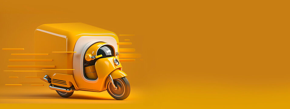 Trendy minimalistic food delivery service or online food order application banner design template with smartphone screen and delivery scooter or it. Vector illustration