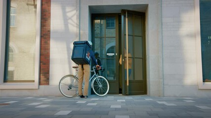 Happy Food Delivery Man Wearing Thermal Backpack on a Bike Delivers Restaurant Order to a Beautiful Female Customer