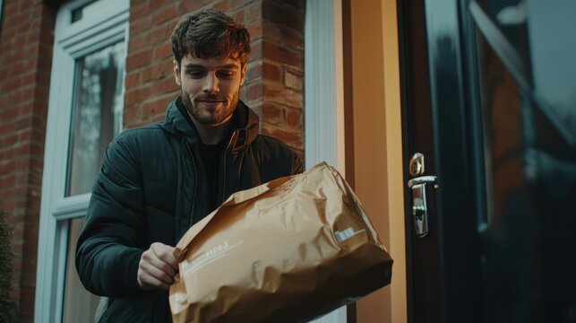 Smiling pizza delivery man promotes fast food delivery service