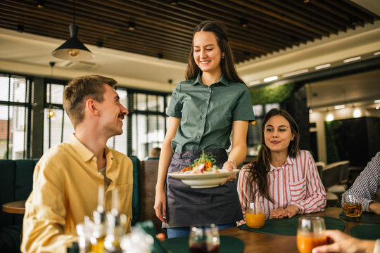 Waitress brings out the first meal, which is caesar salad, to her guests in a restaurant.