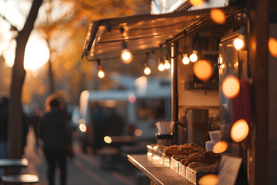 Elegant and modern gourmet food truck serving delicious street food in a bustling city square with a stylish design and inviting atmosphere for a vibrant urban dining experience  3D digital