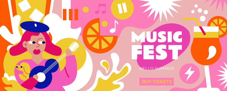 Summer music festival banner to open the warm season. Fresh atmosphere, cool drinks, music, a woman playing the guitar. Perfect for summer parties, outdoor festivals and more.