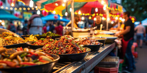 Summer street food festival with diverse cuisines, food trucks and culinary delights, 4K hyperrealistic photo.