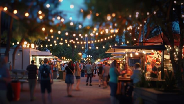 crowd of people on street food festival in summer park on sunset or at night, in style of blurred motion with bokeh