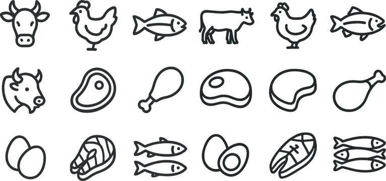 Farm animal and food icon set for cooking and menu design