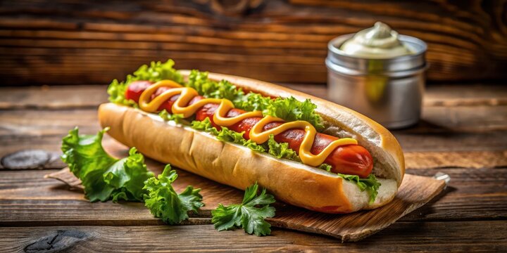 Juicy hot dog placed on a rustic wooden background with subtle cracks and imperfections
