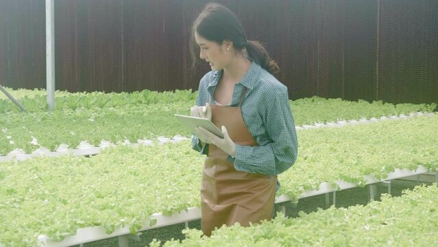 Young asian woman using tablet for control and inspect system innovation hydroponic vegetable farm, entrepreneur doing agriculture and examining nutrition food in the greenhouse, one person.