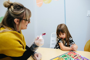 Teacher holds a spoonful of food to feed to student and student pouts