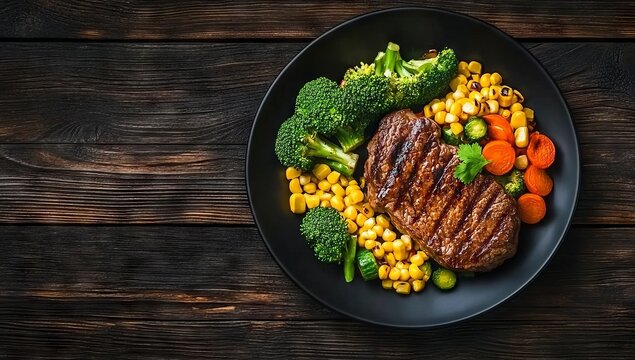 A mouth-watering sirloin steak with corn, tomato, and broccoli, expertly cooked in an air fryer, is served on a dish placed on a wooden table as a popular Hong Kong fast food option