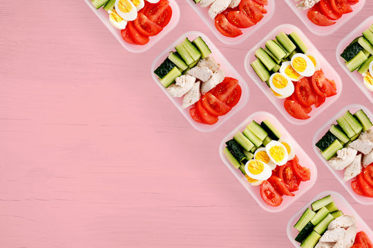 Chicken breast and vegetables in containers. Flat lay