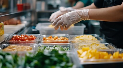 In a bustling kitchen, skilled hands carefully arrange colorful vegetables and fruits in clear containers. The atmosphere is filled with purpose as chefs prep for a delicious meal