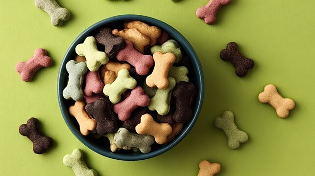 Bone shaped dog biscuits in an assortment of colors filling a teal bowl with more treats scattered around on a bright green backdrop, representing pet nutrition and rewards