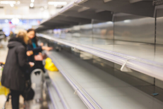 Empty supermarket aisle with freezers showcases and various products, supermarket, aisle, empty, freezers, showcases, products