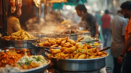 An Indian street food stall bustling with customers, serving crispy samosas, pakoras, and spicy chaat to hungry visitors.