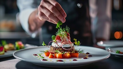 Modern food stylist decorating meal for presentation in restaurant. Closeup of food stylish. Restaurant serving,
