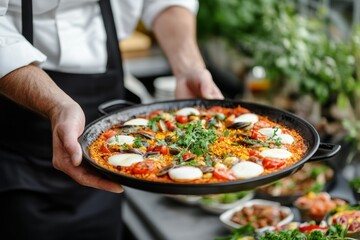 A chef presenting a beautifully arranged plate of paella at a Hispanic food tasting event
