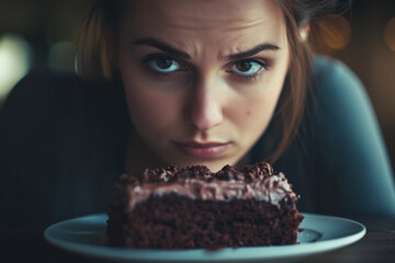 Woman looking intensely at a delicious chocolate cake sweet dessert food on transparent background