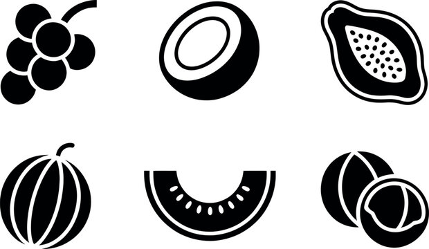 Collection of six hand drawn black and white fruit icons for healthy lifestyle and food design elements vector