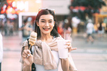 Happy asian foodie woman eating street food holding korea skewer oden