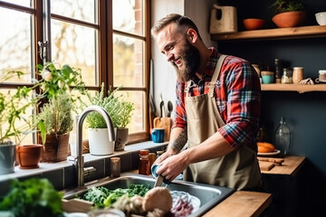 A man is cutting vegetables in the kitchen created with Generative AI technology