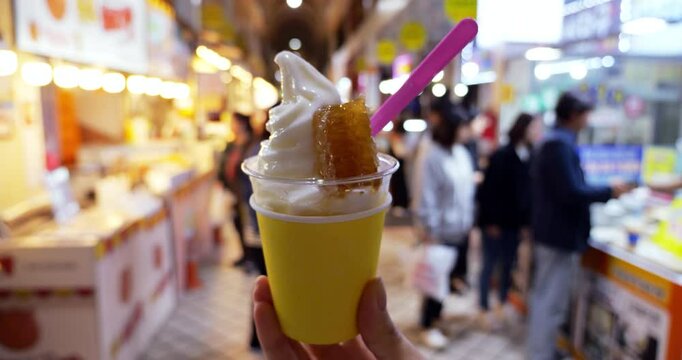 Creamy vanilla soft serve ice cream topped with golden piece of honeycomb, served in yellow cup with pink spoon. Selective focus shot captures traditional sweet snack at Jungang Market in Sokcho