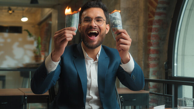 Happy male Arabian Indian business man crazy mad laughing guy joyful excited businessman office investor rejoicing fooling burn money dollars waste finance cash salary enjoy burning banknotes have fun
