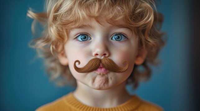 Boy playing with fake moustache. Happy April Fools' Day and funny fake moustache pranks. Kid having fun and playing.